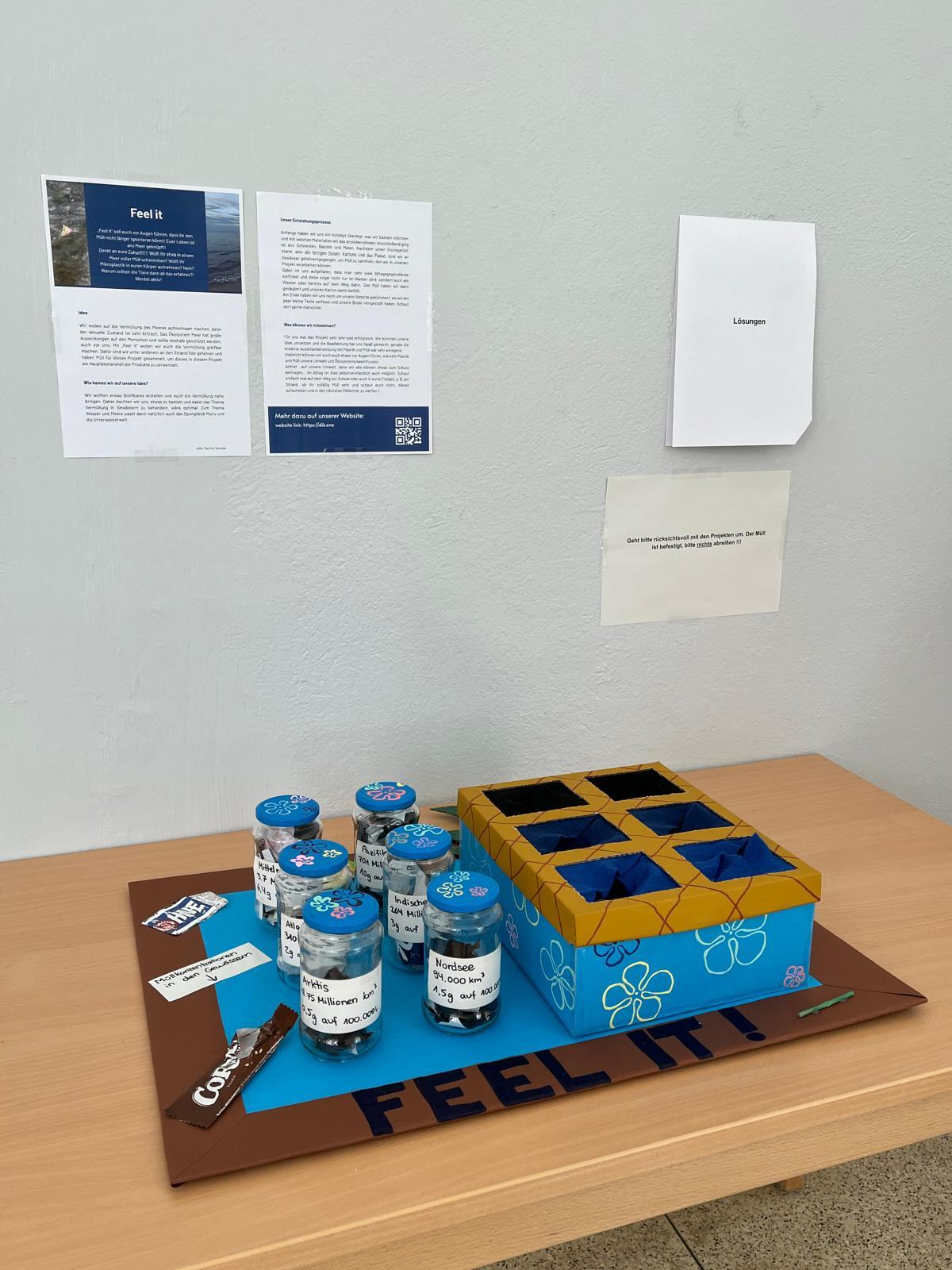 Wir wollen auf die Vermüllung des Meeres aufmerksam machen, denn der aktuelle Zustand ist sehr kritisch. Das Ökosystem Meer hat große Auswirkungen auf den Menschen und sollte deshalb geschützt werden, auch vor uns. Mit „Feel it“ wollen wir euch die Vermüllung greifbar machen. Dafür sind wir unter anderem an den Strand/See gefahren und haben Müll für dieses Projekt gesammelt, um dieses in diesem Projekt als Hauptbestandteil der Produkte zu verwenden.