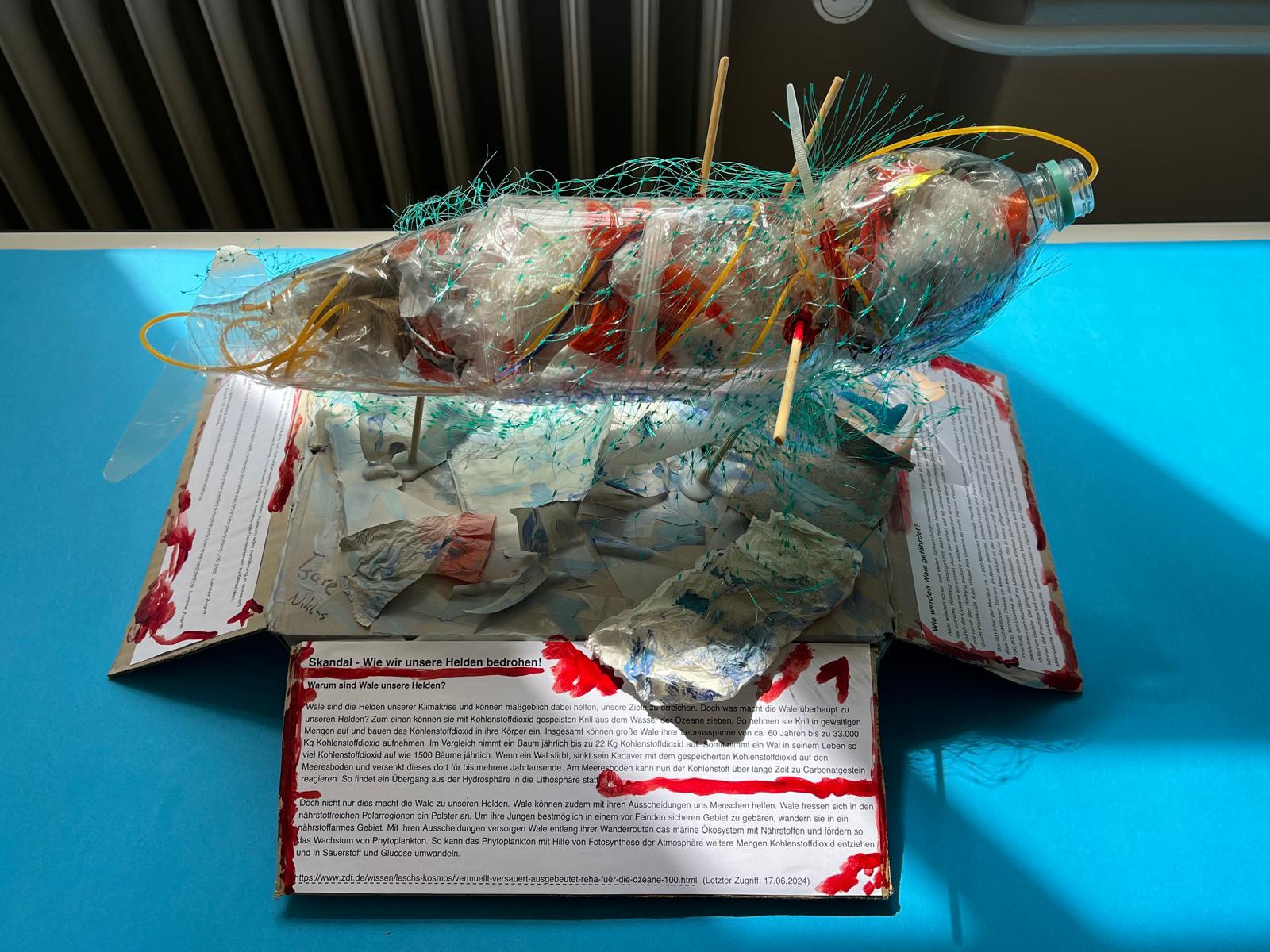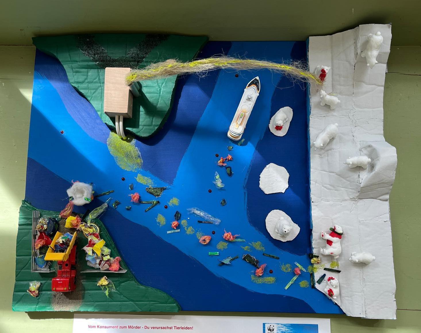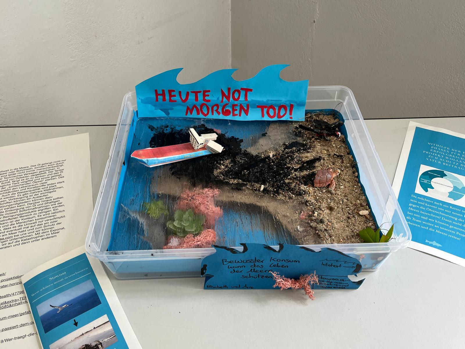 Um die eine Million Tonnen Öl fließen jährlich weltweit in die Meere. Das Öl gelangt nicht nur durch illegale Tankreinigungen ins Wasser, Gewässer oder Bohrinseln, sondern auch durch Tankerunfälle. Diese Ursachen der Tankerunfälle sind leider nicht immer menschenbedingt, da die Unfälle auch durch Naturkatastrophen oder Technisches Versagen geschehen. In unserem Exponat haben wir ein Tankerunfall aufgrund von Defekten dargestellt. Der Tanker ist mit Erdöl beladen, doch durch die Defekte am Schiff, fängt es an zu senken und das Öl fließt dementsprechend ins Meer. Dabei werden jegliche Tiere vergiftet und sowie getötet, besonders hoch ist die Zahl der Vögel, welche an der „schleichenden Ölpest“ sterben. Mit dem Exponat, als auch dem Slogan „Heute Not, Morgen Tod!“ wollen wir auf die Katastrophen im Meer aufmerksam machen, wobei viele Tiere vorerst in Not geraten und dann unter anderem aufgrund mangelnder oder keiner Hilfe, sterben.